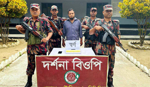 দর্শনা রেলস্টেশন থেকে অবৈধভাবে পাচারের সময় ১০টি স্বর্ণের বারসহ এক পাচারকারীকে আটক করেছে বর্ডার গার্ড বাংলাদেশ (বিজিবি)। উদ্ধারকৃত স্বর্ণের মোট ওজন ১ কেজি ১৬৬ গ্রাম এবং আনুমানিক বাজার মূল্য প্রায় ২ কোটি ৪৮ লাখ টাকা।
